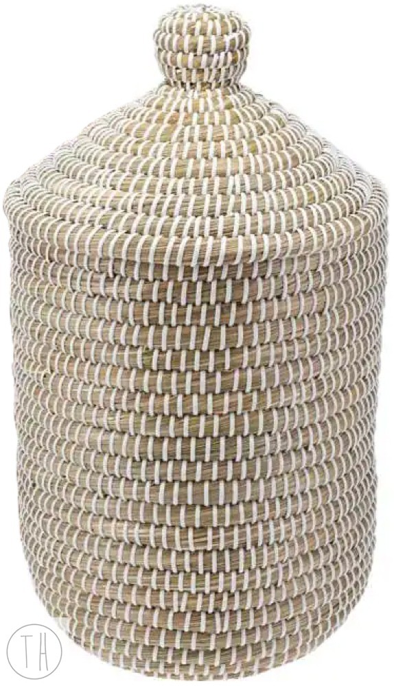 Zadbaj o estetyczne i ekologiczne przechowywanie w swoim domu dzięki temu wysokiemu koszowi z naturalnej plecionki. Jego unikalna struktura, wzmocniona białym przeplotem, nadaje wnętrzu lekkości i wprowadza modny klimat boho lub skandynawski. Praktyczna pokrywka z uchwytem pozwala na dyskretne ukrycie zawartości, dzięki czemu kosz idealnie sprawdzi się w łazience na drobiazgi, w sypialni na tekstylia lub w salonie jako stylowy organizer.