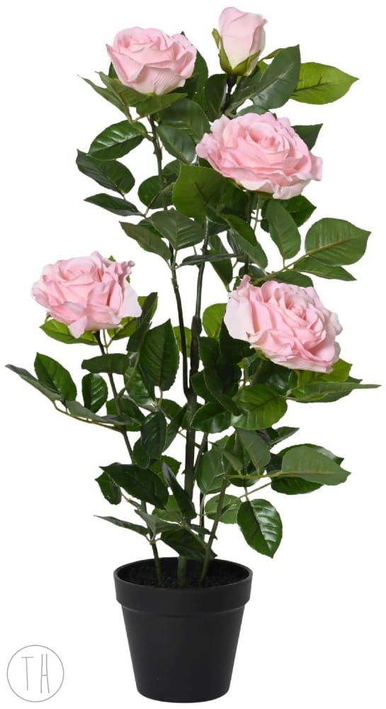 Niezależnie od pory roku, ta elegancka sztuczna róża wprowadzi do Twojego domu aurę świeżości i romantyzmu. Roślina prezentuje się niezwykle naturalnie dzięki kilku rozłożystym kwiatom w delikatnym, pastelowym różu. Gęste, ciemnozielone liście z wyraźnym unerwieniem stanowią doskonałe tło dla kwiatów, tworząc harmonijną i stylową dekorację, która nie wymaga podlewania ani specjalnego nasłonecznienia.